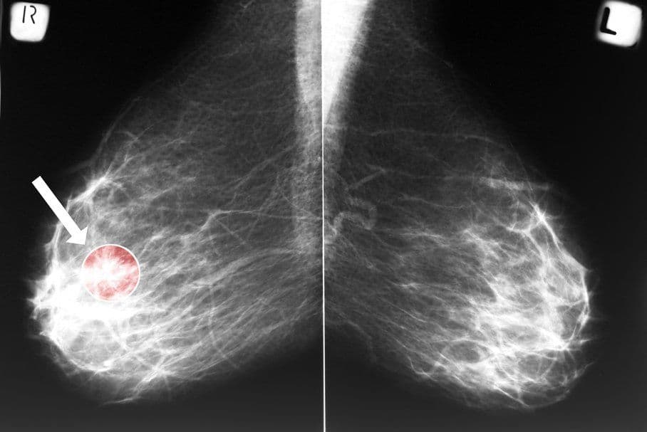 Poniżej zdjęcie raka piersi, widoczne na mammografii.