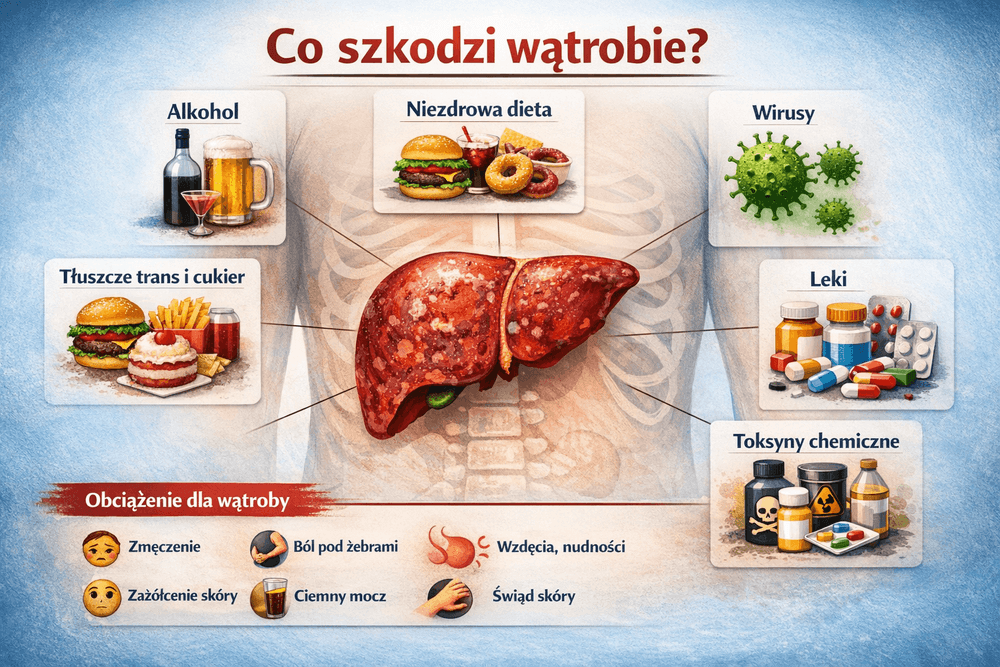 Toksyczne uszkodzenie wątroby wywołane lekami to jedna z najczęstszych przyczyn ostrej niewydolności wątrobowej. Najbardziej szkodliwe są leki przeciwbólowe z paracetamolem w dawkach powyżej 4 g na dobę. Przy jednoczesnym spożyciu alkoholu nawet dawki terapeutyczne mogą powodować ciężkie uszkodzenie miąższu wątroby. Niesteroidowe leki przeciwzapalne (ibuprofen, diklofenak) również obciążają wątrobę przy długotrwałym stosowaniu. Toksyczne uszkodzenie mogą wywoływać także antybiotyki, statyny, leki przeciwpadaczkowe, a nawet suplement diety i preparaty ziołowe, w tym popularne suplementy odchudzające, których toksyczne działanie bywa lekceważone.